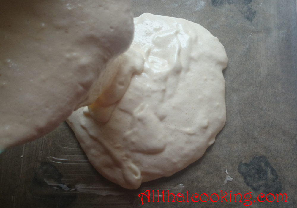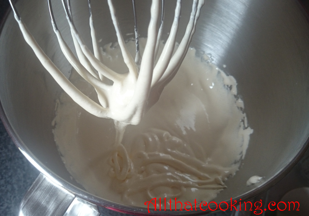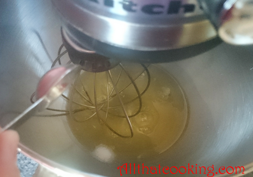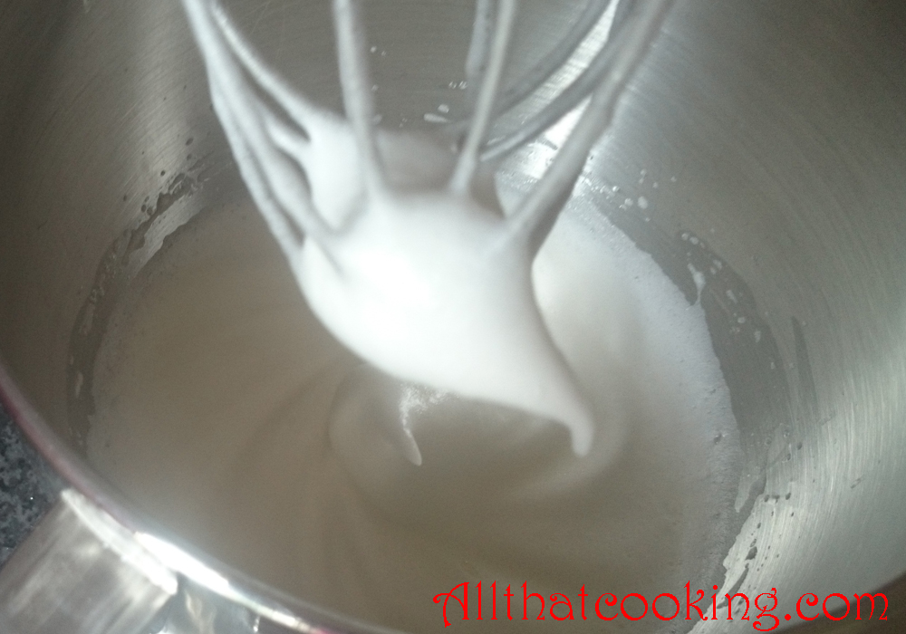2. Pour egg whites into the stand mixer bowl, add salt and whisk at medium high speed until stiff peaks form. (You know its ready when if you were to turn the bowl up side down, the merengue stays put.)