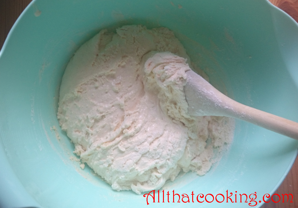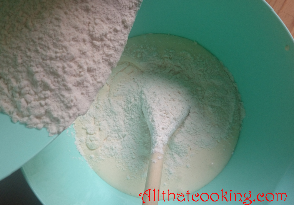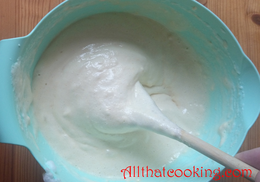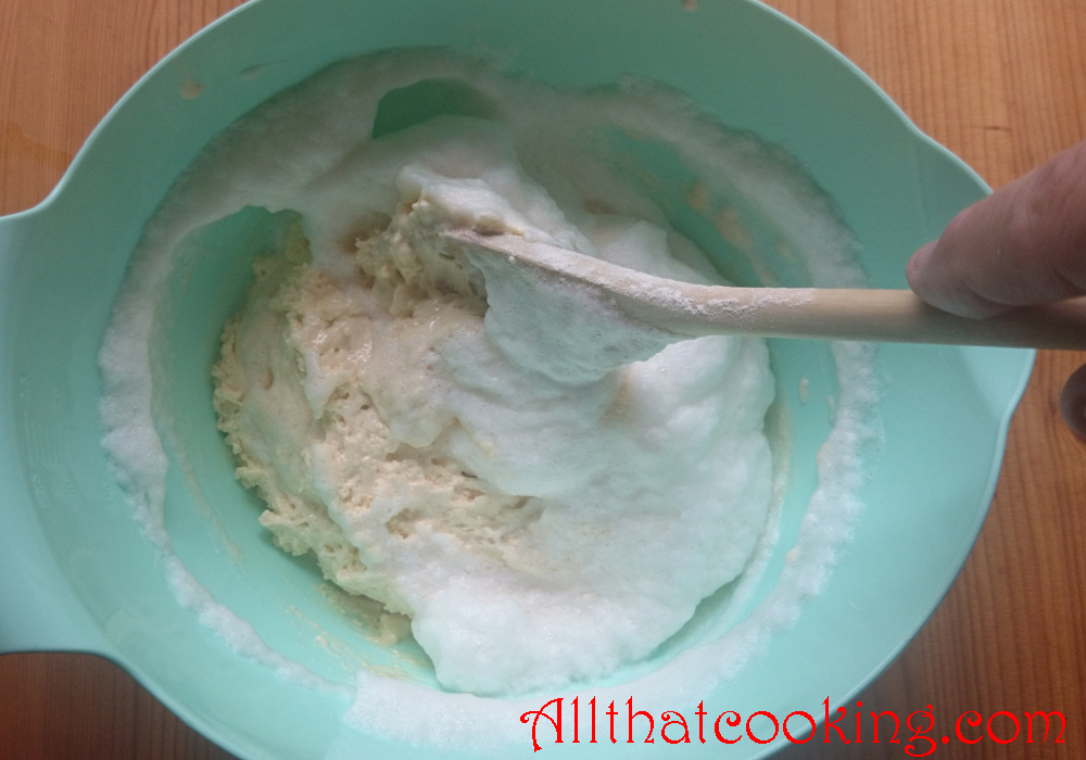 4. Gently fold 1/3 of the egg whites to the egg/flour mixture until well combined. Gently fold in the remaining whites until well combined and the mixture is smooth.