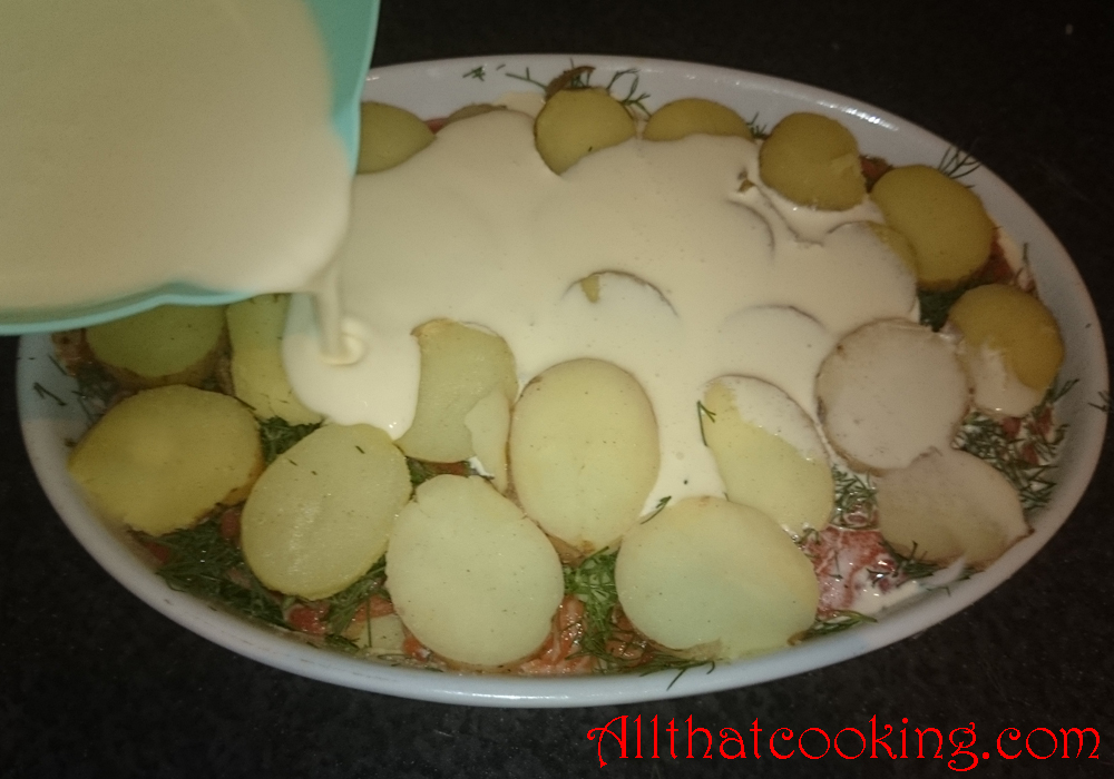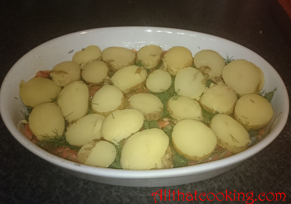 5.  Cover salmon with half of the dill and use half of the remaining potatoes to make the next layer. Lightly salt and pepper.