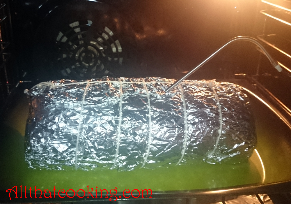 12. Place the package in a baking dish, stick in a meat thermometer and pop it into the preheated oven.