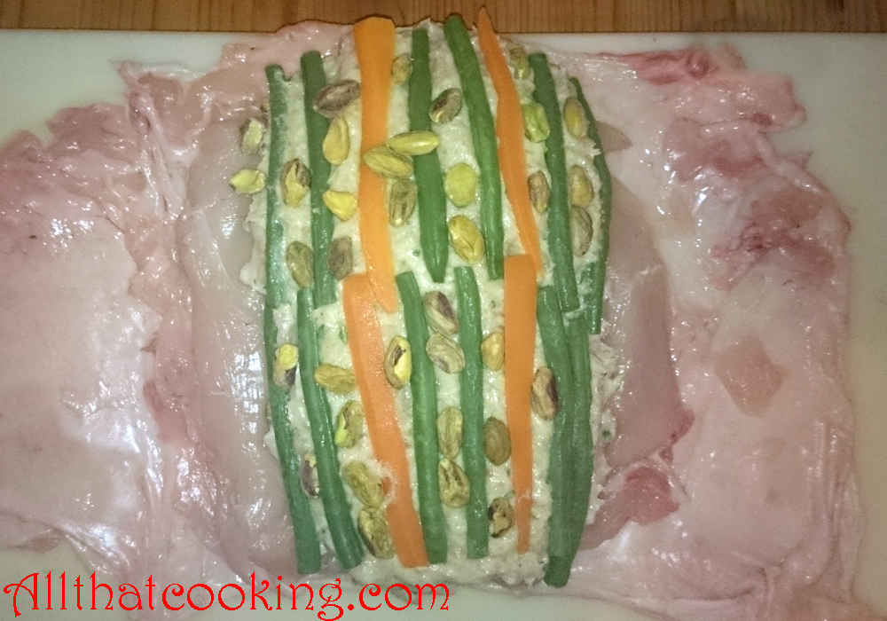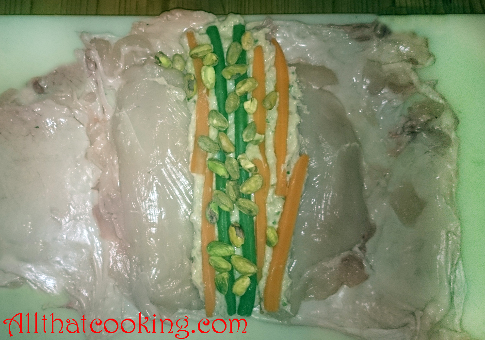 Galantine was a new one for me, but I tell you, if you need a wow dish for the holidays, galantine is your baby. Galantine is a French classic made from deboned meat or fowl, stuffed and formed into a log shape, and the fowl’s skin is used as the casing, just like for sausage. The forcemeat filling is layered with carrots, green beans, ham and pistachios, so that when it is sliced, you have a beautiful presentation with specks of colorful veggies dotting the center of each slice.