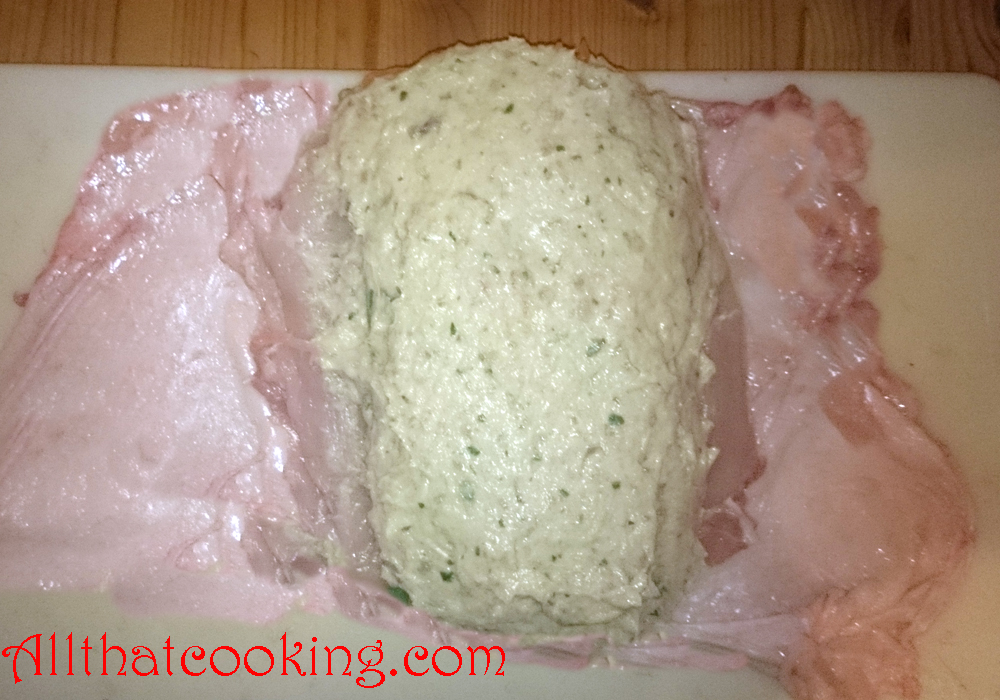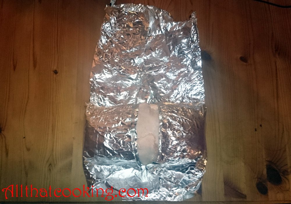10. Carefully bring the skin over the forcemeat and shape it to a roll. Lay the roll on a strip of aluminum foil and bring the foil up over then ends of the roll.