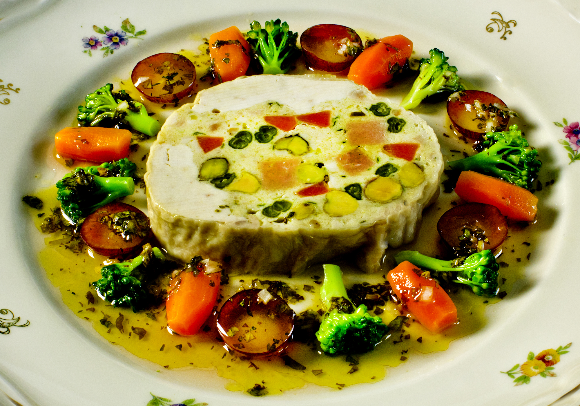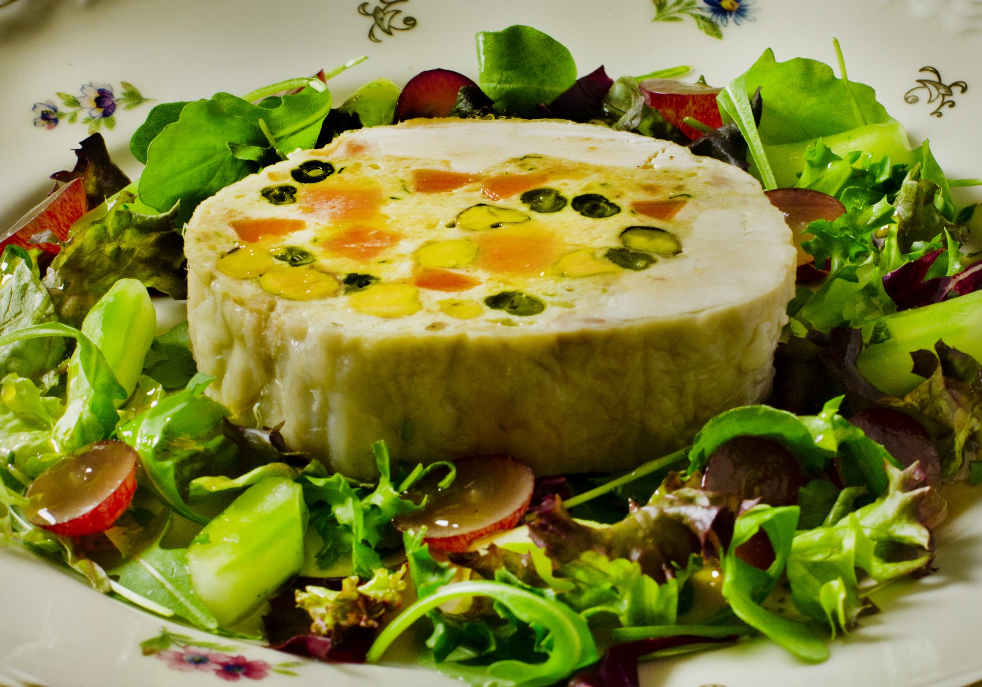 Oli presented his galantine two ways. One with steamed vegetables and grapes the other with a light salad in which grapes add some sweetness. He dressed both with a savory/sweet vinaigrette of Tawny Port wine, olive oil some white wine vinegar and herbs.