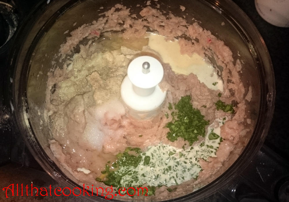 Cut the loose chicken parts into chunks and place in the bowl of a food processor. Process for about a minute, or until it is a ground meat consistency. Then add the soaked bread and cream, the onion, garlic, vodka mix, the egg, parsley, salt and pepper. Process until smooth.