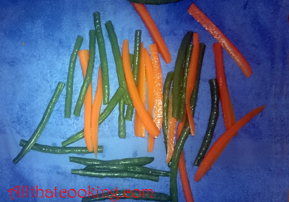 3. Toss the beans and carrots into the boiling water and cook for about 2 1/2 minutes. Use a large, slotted spoon remove the veggies and quickly plunge them into the ice bath. Once they are totally cooled, remove them from the water to a dry cloth.