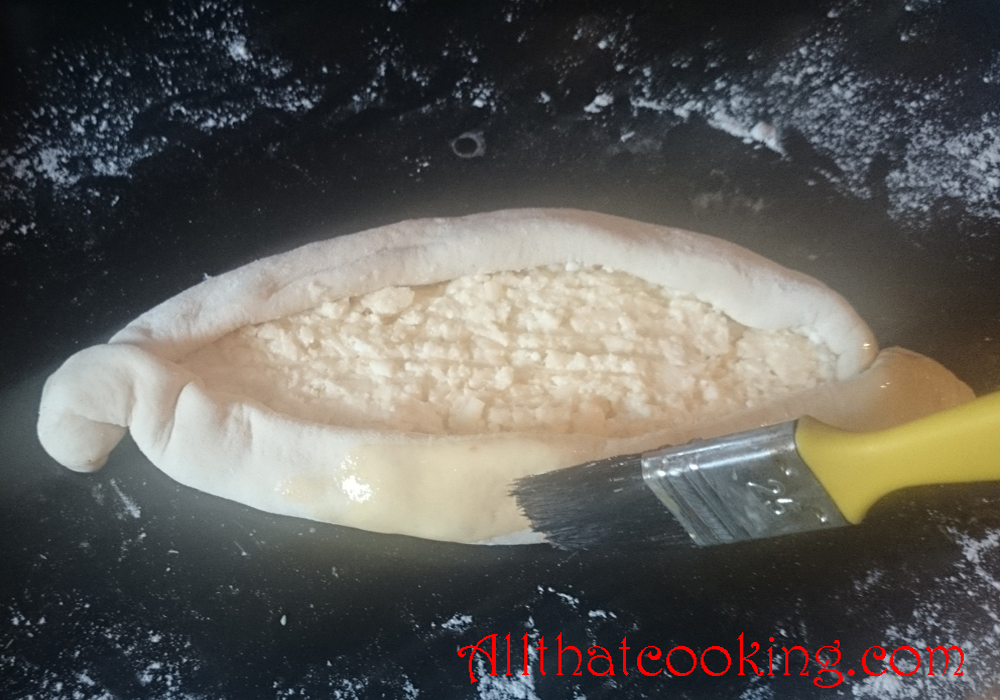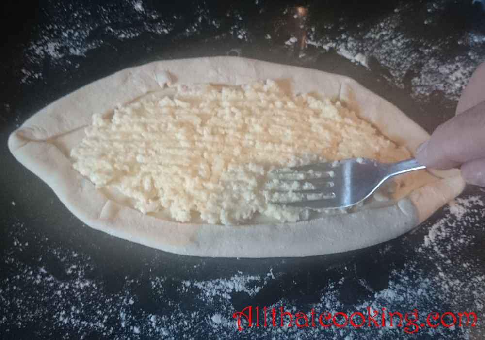 6.  Divide the cheese filling among the four ovals and again fold over the edge all around each pie so that you build up the edge and it overlaps the cheese a bit.