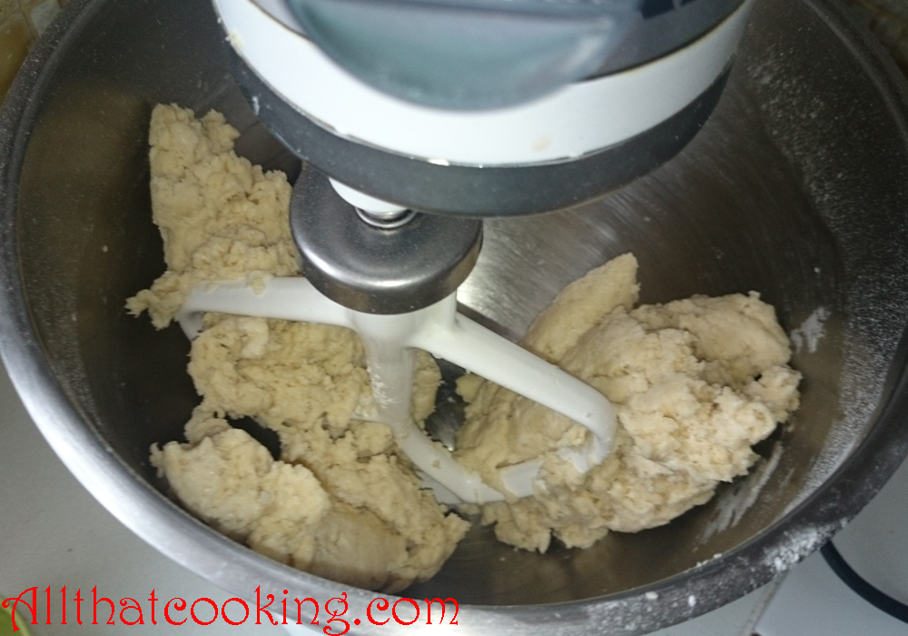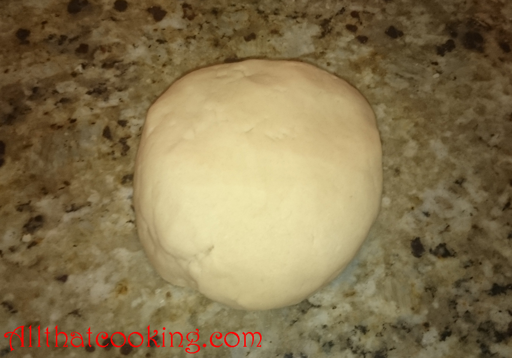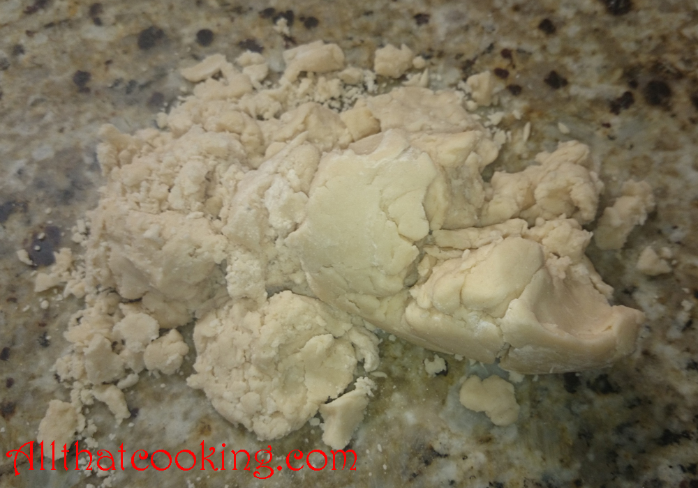 Gather dough together and knead until well combined.  Knead as little as possible so that it doesn’t become too elastic.