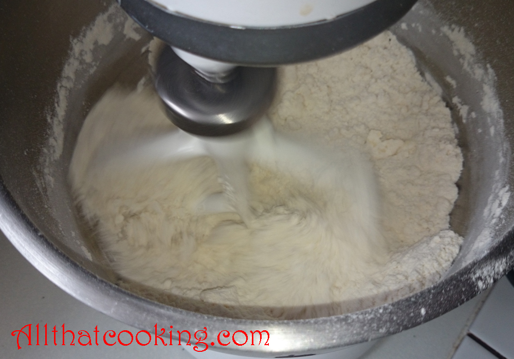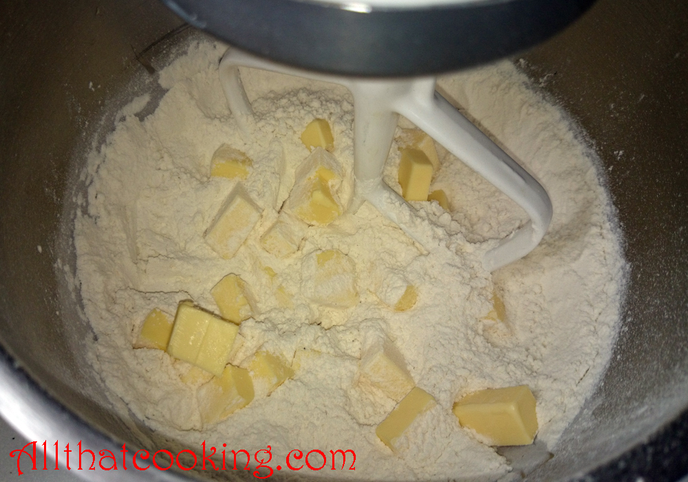 Oli used a stand mixer this time, but you can use a food processor as well.  This recipe makes 2 crusts.  You can put the dough in a plastic freezer bag and freeze  for up to two months.