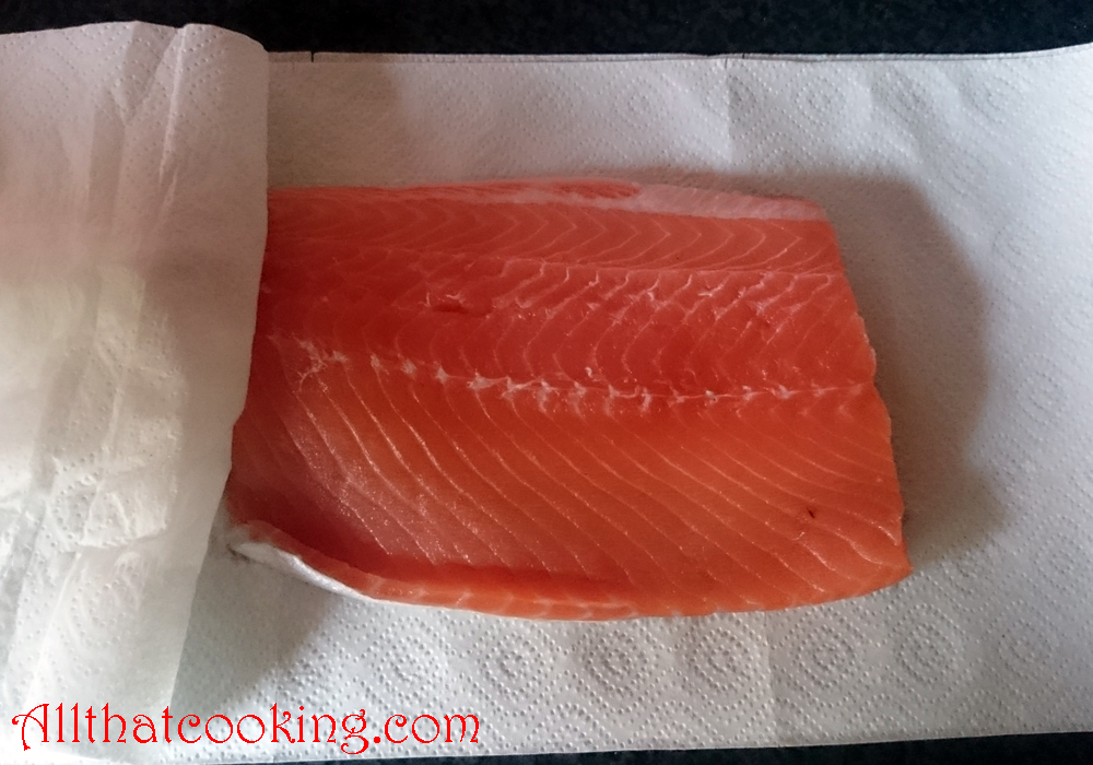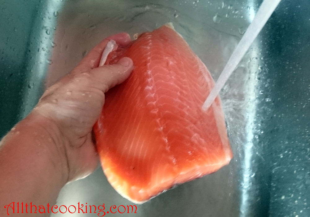 - Wash the brine off the salmon fillet under cold running water. Then pat dry on a paper towel.