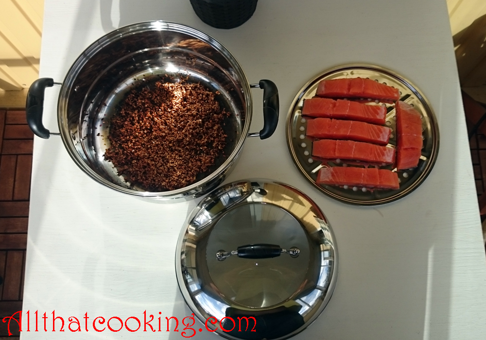 - Spread the wood evenly over the bottom of the smoker. Cut the salmon fillet in 5 to 6 equal pieces and place them on the steamer insert.